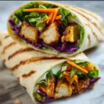 A vibrant and crunchy Asian Chicken Salad Wrap combining crispy air-fried chicken strips with fresh Romaine lettuce, tri-colored coleslaw, crunchy chow mein noodles, and sliced almonds, all tossed in a creamy honey sesame dressing and wrapped in warm flour tortillas. Perfect for a quick, flavorful lunch or light dinner.