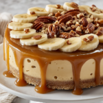 This Banana Caramel Nut Cheesecake combines a buttery graham cracker crust with a rich and creamy cream cheese filling, topped with fresh banana slices, luscious caramel sauce, and crunchy nuts. Perfectly baked to a slight jiggle in the center, this dessert delivers a harmonious balance of sweet, creamy, and nutty flavors, ideal for special occasions or indulgent treats.