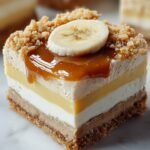 Delightfully creamy Banana Cream Cheese Bars with a crunchy graham cracker crust, layered with sweet banana slices and a luscious caramel drizzle. These bars are perfect for a sweet dessert or a special snack, combining classic flavors in a simple bake.