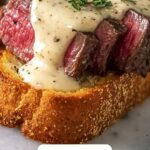 Beef Tenderloin Crostini with Parmesan Cream Sauce is an elegant appetizer featuring tender slices of beef atop crisp baguette crostini, finished with a rich and creamy Parmesan sauce. Perfect for entertaining, these bite-sized treats combine the savory flavors of perfectly seared beef with a luxurious, garlicky cheese sauce.