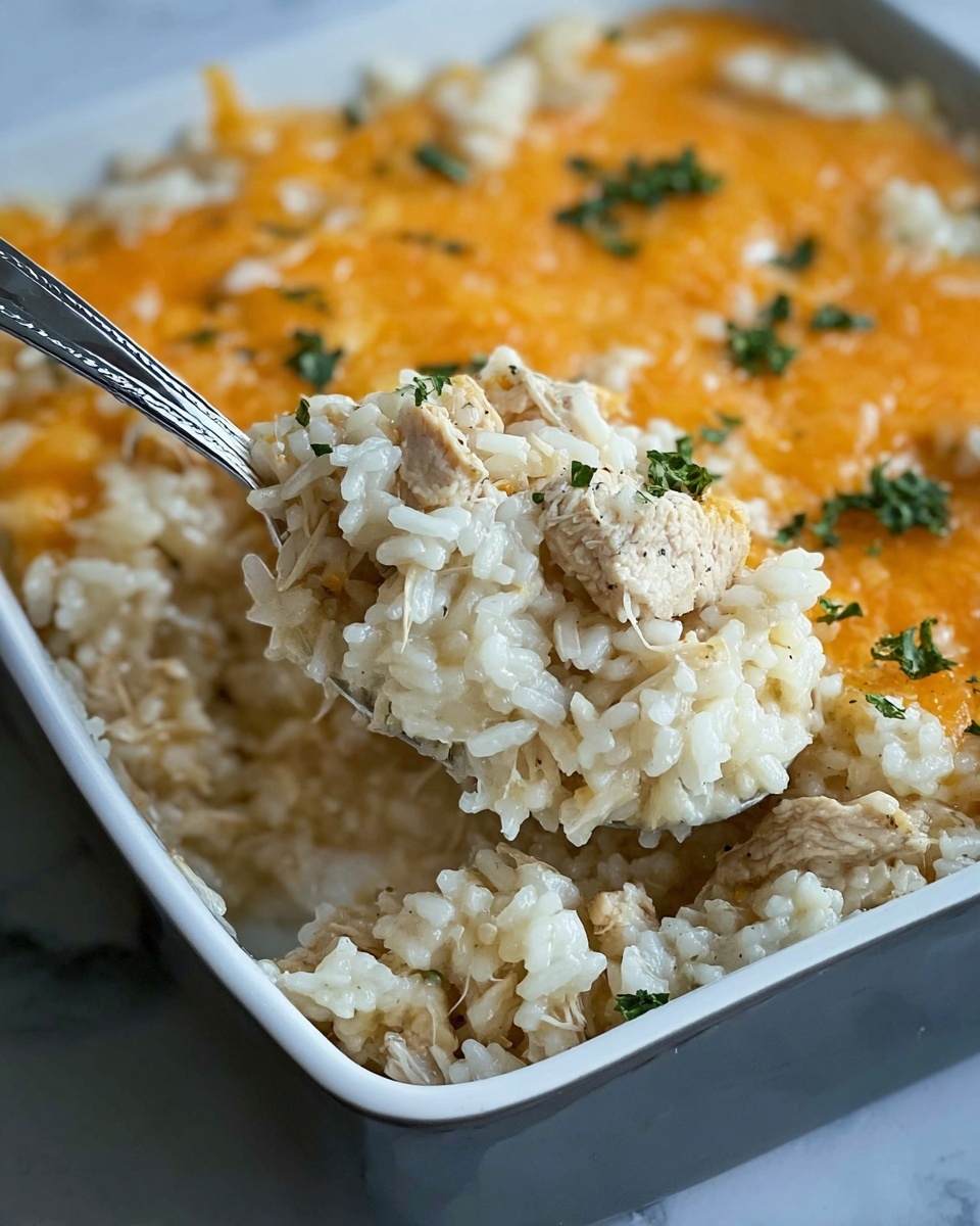 7. Garnish and Serve: Once baked, garnish the casserole with freshly chopped parsley if desired. Serve warm and enjoy this creamy and cheesy chicken and rice casserole.
