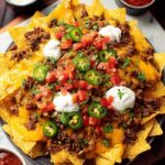 Finish off your nachos by generously scattering diced avocado and chopped cilantro across the top. Add dollops of sour cream and spoon on the salsa or pico de gallo. These fresh garnishes are essential — they bring creaminess, herbal brightness, and tang that elevate every bite.
