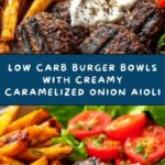 These burger bowls with caramelized onion aioli offer a delicious, low-carb alternative to the traditional burger. Featuring juicy ground beef served atop fresh romaine or mixed greens and topped with cherry tomatoes, avocado, red onion, cheddar cheese, and pickles, this meal is elevated by a creamy, savory homemade caramelized onion aioli. Perfect for weeknight dinners, meal prep, or anyone craving the rich flavors of a burger without the bun.
