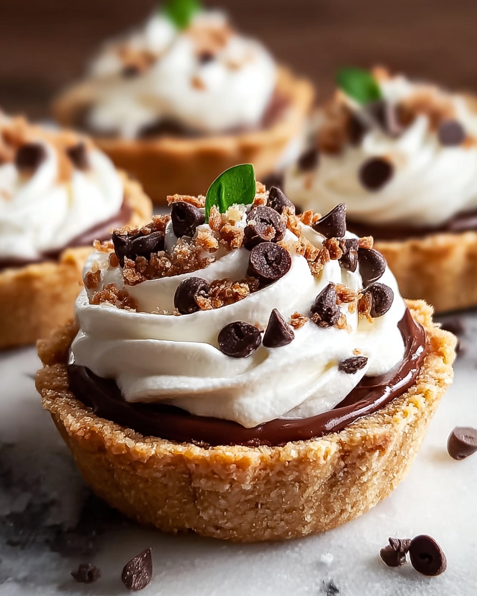 Once the cookie cups are completely cooled, it’s time to fill them. You can either pipe the filling with a piping bag for a neat presentation or spoon it in with a small spoon—both ways work beautifully. Top each one with extra chocolate chips or sprinkle on some chopped pistachios for that perfect crunch and pop of color. Pop the filled cookie cups into the fridge for 15 to 20 minutes to chill and set before serving.