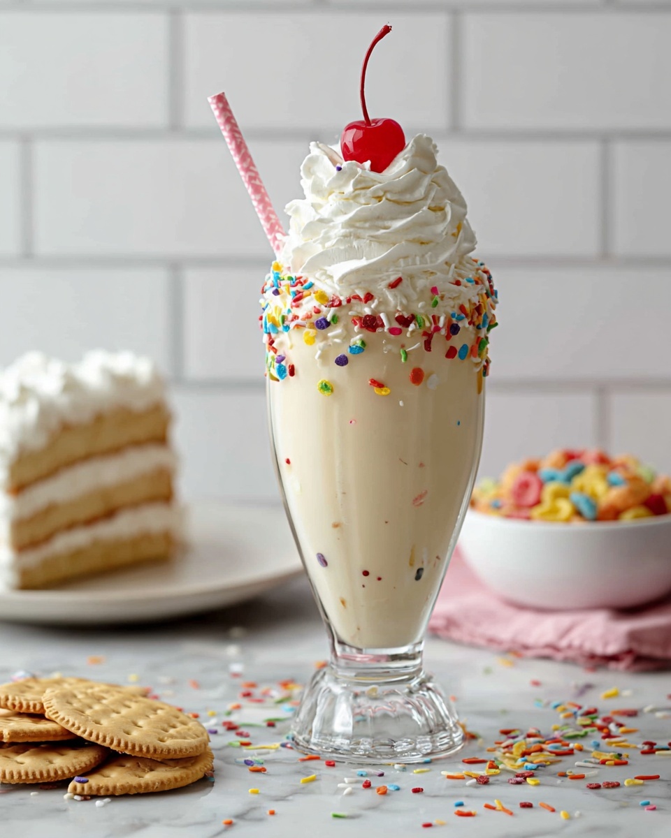 - Assemble and Garnish: Pour the creamy milkshake into the prepared sprinkle-rimmed glass. Generously top with whipped cream, and finish by placing a maraschino cherry on top for that classic, perfect milkshake presentation.