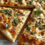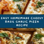 This Cheesy Basil & Garlic Pizza recipe features a homemade, airy pizza dough topped with a flavorful blend of mozzarella and Parmesan cheeses, fresh basil leaves, and minced garlic. Perfectly baked to a golden crust with gooey cheese, this pizza combines aromatic herbs and rich cheese for a delightful homemade pizza experience.