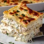 This Cheesy Chicken Alfredo Lasagna is a creamy, comforting Italian-American dish combining tender shredded chicken, rich Alfredo sauce, and a blend of cheeses layered between lasagna noodles. Easy to prepare and perfect for family dinners, it bakes to a golden bubbly perfection garnished with fresh parsley.