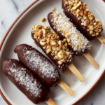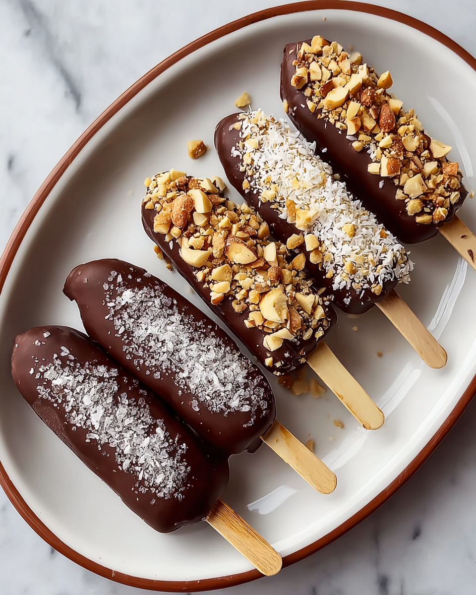 Delight in these irresistible Chocolate Covered Banana Pops, featuring ripe bananas dipped in rich vegan chocolate and topped with your choice of nuts, shredded coconut, granola, cacao nibs, and flaky salt. Perfect as a refreshing, easy-to-make frozen treat for all ages.