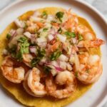 4. Assemble and Serve: When ready to serve, spoon the coconut shrimp ceviche generously onto each tostada shell. Garnish with optional avocado slices, extra fresh cilantro, and a squeeze of lime if desired. Serve immediately to ensure the tostada shells remain crisp and crunchy.