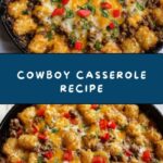 Cowboy Casserole is a hearty and comforting baked dish featuring ground beef, creamy soups, corn, crispy tater tots, and melted cheddar cheese. Perfect for family dinners, this easy one-dish meal combines savory flavors with a satisfying crunch.