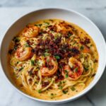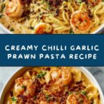 This Mouthwatering Creamy Chilli Garlic Prawn Pasta combines perfectly cooked spaghetti with succulent prawns in a rich, creamy garlic and chili sauce. This quick and easy recipe is full of flavor with a hint of heat from chili flakes, complemented by parmesan cheese and fresh parsley, making it an ideal gourmet meal for any pasta lover.