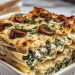 This Creamy Spinach Mushroom Lasagna is a comforting Italian main course featuring layers of tender lasagna noodles, sautéed mushrooms and spinach, ricotta cheese blended with egg, and a rich homemade white sauce. Topped with mozzarella and Parmesan cheeses, it’s baked until golden and bubbly, delivering a hearty vegetarian dish perfect for family dinners or special occasions.