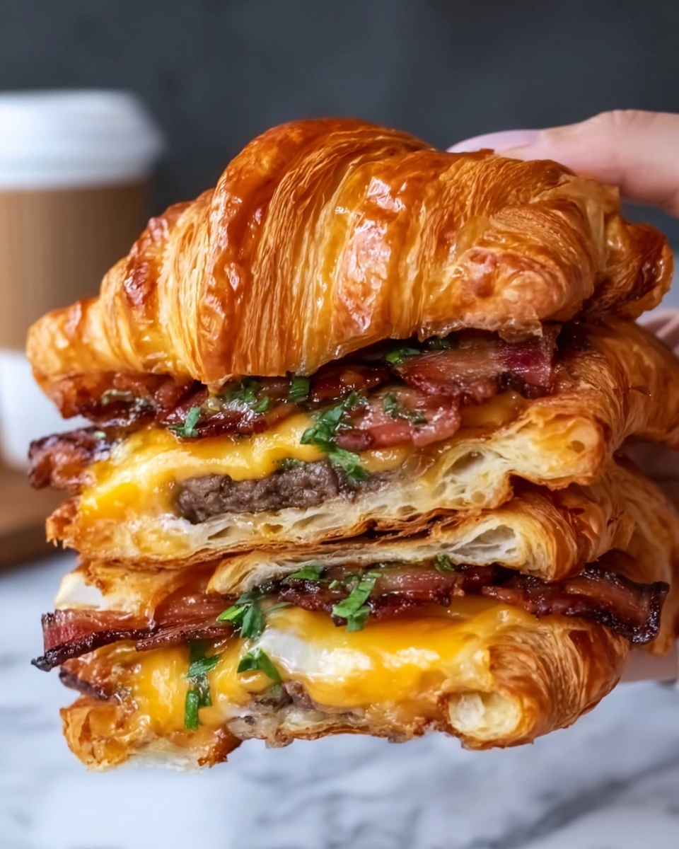 Delicious Croissant Cheeseburgers that combine flaky, buttery croissants with juicy, flavorful burger patties topped with melted cheddar or American cheese and your favorite condiments and toppings. Perfect for a quick and indulgent meal, offering a tasty twist on the traditional cheeseburger.