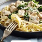 This Dairy-Free Chicken Alfredo is a creamy, flavorful pasta dish made with tender chicken breast, gluten-free farfalle, and a rich dairy-free Alfredo sauce featuring dairy-free butter, heavy cream, and shredded Parmesan. Enhanced with aromatic herbs and spinach, this recipe serves a comforting meal suitable for those avoiding dairy without compromising on taste.