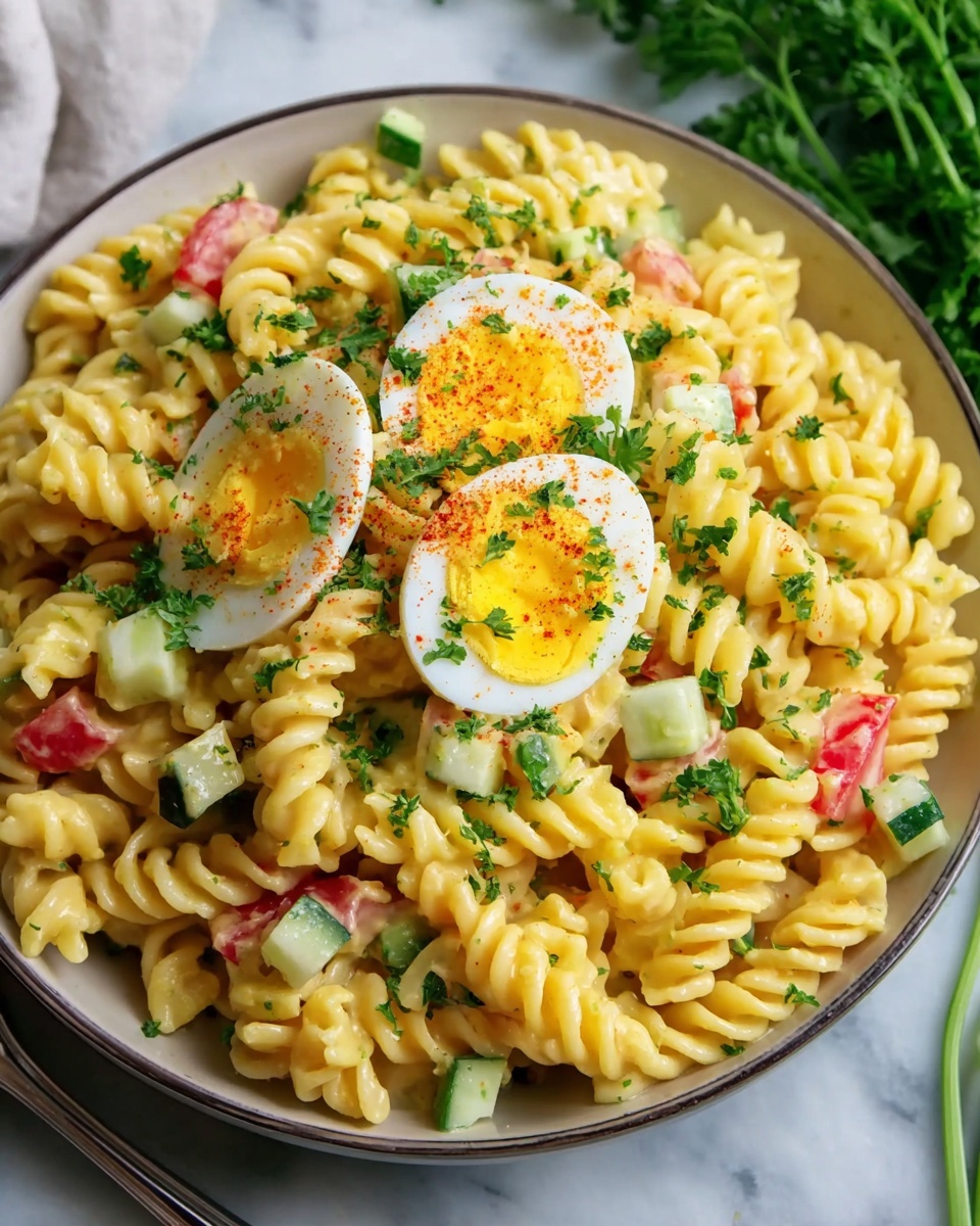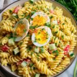 Try serving this Deviled Egg Pasta Salad Recipe in hollowed-out tomatoes or small lettuce cups for a whimsical appetizer. You can also spoon it onto toasted baguette slices for a fun finger-food twist or layer it in a clear glass bowl for a beautiful, colorful display that invites everyone to dig in.