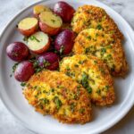 Sprinkle the grated Parmesan cheese evenly over the chicken breasts and potatoes. The cheese will melt during baking, forming a savory, slightly crispy crust that’s the perfect complement to the tender meat and creamy potatoes.