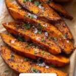 Crispy and flavorful Garlic Parmesan Sweet Potato Wedges baked to golden perfection, seasoned with a blend of herbs and spices for a deliciously cheesy and savory side dish or snack.