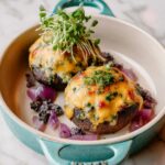 Once your stuffed potatoes return from the oven, sprinkle chopped green onions on top for a fresh, mild bite and a lively color pop. Serve them straight away while they’re warm, melty, and absolutely delicious.