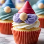 - Add the Nose: Roll a small ball of white fondant and gently press a mini chocolate chip into it to form the gnome’s nose. Attach the nose onto the fondant face on each cupcake.
