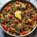 Greek Chicken and Lemon Rice is a flavorful one-pan dish featuring tender, oven-baked chicken thighs seasoned with oregano and paprika, served on a bed of aromatic lemon-infused rice. This easy-to-make recipe combines Mediterranean herbs, zesty lemon, and perfectly cooked rice, delivering a comforting yet bright meal perfect for family dinners.