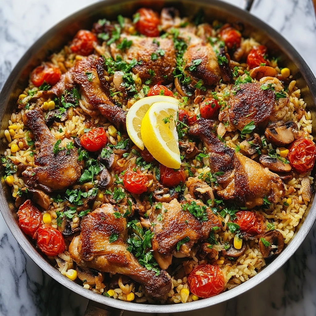 Gently nestle the seared chicken back on top of the rice, skin-side up. Cover the skillet with a lid or foil to trap steam and promote even cooking. Transfer to a preheated oven at 350°F (175°C) and bake for 35 minutes, allowing the flavors to meld and the rice to tenderize perfectly.
