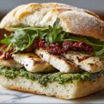 A delicious and easy grilled chicken sandwich featuring juicy chicken breasts seasoned and cooked to perfection, topped with melted cheese, fresh tomato, and peppery arugula, all layered with vibrant basil pesto on toasted ciabatta buns. Perfect for a satisfying lunch or dinner with a fresh, herbaceous twist.