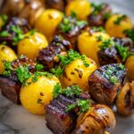 Grab your skewers and load them with the marinated steak, potatoes, and mushrooms, alternating between each ingredient for a balanced bite. If you’re using wooden skewers, don’t forget to soak them in water for at least 30 minutes beforehand — this keeps them from burning while grilling. The visual appeal alone will have everyone excited to dig in.