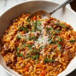 Serve the Ground Beef Orzo with Tomato Cream Sauce Recipe in shallow bowls to show off the creamy texture and colorful spinach. For a fun twist, bake it in a casserole dish topped with extra parmesan and breadcrumbs until bubbly and golden for a comforting, baked pasta vibe that everyone will love.