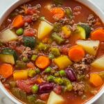 A hearty and nutritious Ground Beef Vegetable Soup loaded with tender potatoes, fresh vegetables, and rich tomatoes, perfect for a comforting meal any day of the week. This classic soup combines browned ground beef, carrots, celery, corn, green beans, peas, and herbs, simmered slowly to blend flavors into a deliciously warm dish.