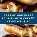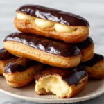 This homemade eclairs recipe features light and airy choux pastry filled with a rich and creamy vanilla custard, then dipped in a luscious chocolate ganache. Perfect for an elegant dessert or special occasion, these eclairs combine classic French techniques with accessible ingredients for a delightful treat.