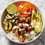 This Hot Honey Chicken Bowl features tender, juicy chicken breasts coated in a spicy-sweet hot honey sauce, paired with roasted zucchini, summer squash, and shredded carrots over a bed of fluffy rice or quinoa. Finished with creamy ranch drizzle and creamy avocado slices, this vibrant, flavorful bowl is perfect for a wholesome and satisfying meal ready in just 40 minutes.