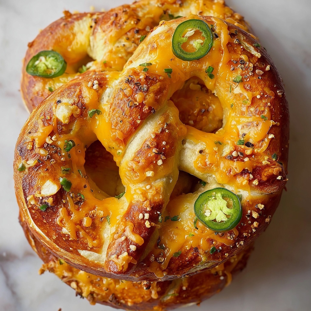 These Jalapeño Cheese Stuffed Pretzels combine soft, chewy pretzel dough with gooey, spicy jalapeño cheese for a delicious homemade snack. The pretzels are boiled briefly in a baking soda bath for that iconic chewy crust, then baked to golden perfection and topped with Parmesan or coarse sea salt. Perfect as a savory appetizer or a satisfying treat for cheese lovers who enjoy a little heat.