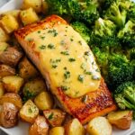 This Lemon Butter Salmon with Crispy Potatoes and Broccoli is a wholesome, flavorful dish perfect for a healthy weeknight dinner. Tender salmon fillets are brushed with a zesty lemon butter sauce and baked to perfection alongside golden, crispy roasted potatoes and vibrant, tender broccoli. This recipe combines simple ingredients and oven roasting techniques to create a balanced meal with a delightful mix of textures and fresh flavors.