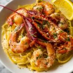 A delightful Lemon Pepper Lobster Shrimp Pasta featuring succulent shrimp and tender lobster tossed in a creamy lemon garlic sauce over linguine, perfect for a flavorful seafood feast.
