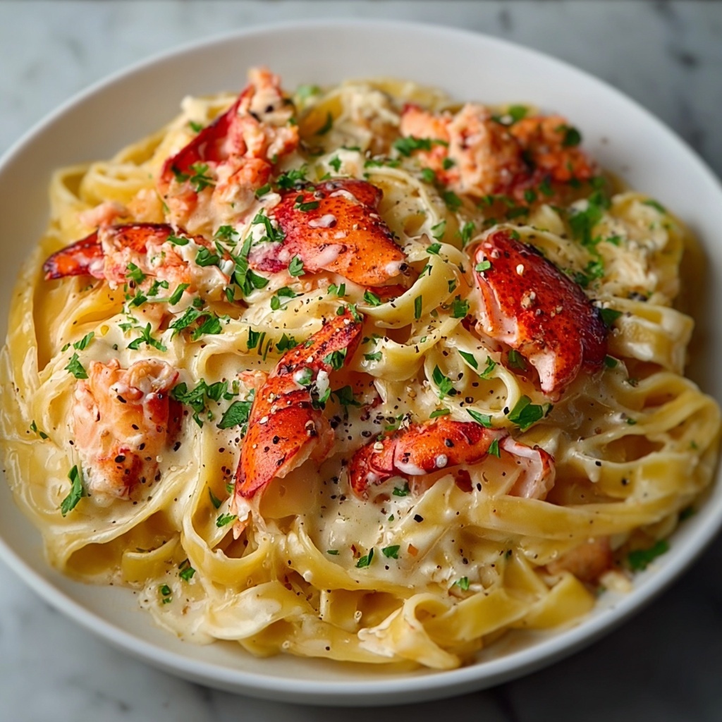 A creamy and indulgent Lobster Alfredo Pasta featuring tender lobster meat tossed in a rich Parmesan and garlic cream sauce with perfectly cooked fettuccine. This elegant yet simple recipe is perfect for a special dinner at home.