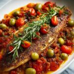 For a more rustic, family-style presentation, bake the fish and vegetable mixture in a large cast-iron skillet and serve it straight to the table. Alternatively, arrange single portions attractively on individual plates with a spoonful of the tomato-olive medley over the fish, finishing with a drizzle of extra virgin olive oil for that final Mediterranean touch.