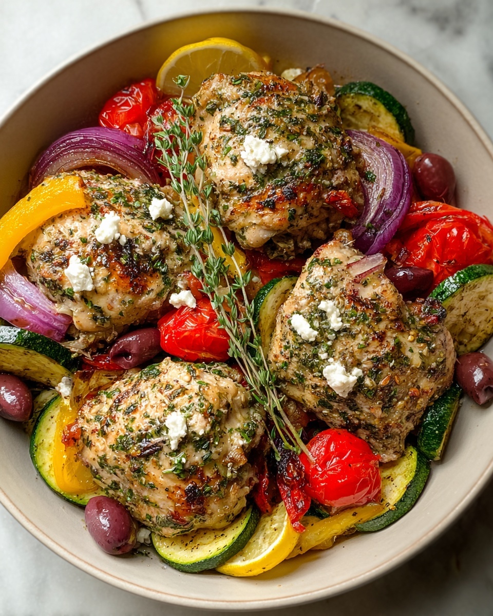 This Mediterranean Chicken Zucchini Bake is a vibrant and healthy one-pan meal featuring tender chicken breasts baked with a colorful medley of zucchini, bell peppers, red onion, cherry tomatoes, and Kalamata olives. Infused with fragrant herbs like oregano, thyme, and basil, and finished with a sprinkle of tangy feta cheese, this dish embodies the fresh, wholesome flavors of the Mediterranean diet, perfect for an easy weeknight dinner.