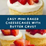 These Miniature Baked Cheesecakes are a delightful dessert featuring a buttery cookie crumb crust with a creamy lemon-infused filling. Perfectly portioned for individual servings, they are topped with whipped cream and fresh chopped strawberries for a refreshing finish.