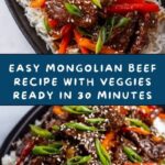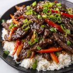 This Mongolian Beef recipe features tender flank steak slices stir-fried to perfection with crisp-tender carrots and red bell peppers, coated in a savory-sweet sauce made from soy sauce, brown sugar, garlic, and ginger. Garnished with green onions and sesame seeds, it’s a quick and flavorful dish perfect for a satisfying weeknight dinner.
