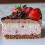 This Neapolitan Cheesecake Cake is a delightful layered dessert combining rich chocolate cake, creamy cheesecake, and sweet strawberry cake. Topped with whipped cream and garnished with fresh strawberries and chocolate shavings, it offers a beautiful and delicious treat perfect for celebrations or special occasions.