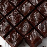 Remove the chilled brownies from the pan, slice into squares, and dig in! The chewy, fudgy texture paired with that glossy chocolate topping is absolutely irresistible.