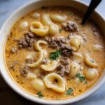This hearty One-Pot Macaroni Cheeseburger Soup combines the comforting flavors of a classic cheeseburger with creamy, cheesy soup all cooked together in one pot. Featuring ground beef, diced potatoes, cheddar cheese, and savory seasonings, it’s an easy-to-make, satisfying meal perfect for family dinners.