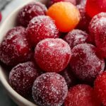 Fresh cranberries work best because they hold their shape and texture well during candying. Frozen cranberries can be softer and may release too much moisture, which affects the syrup’s thickness and the final texture.