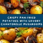 Crispy pan-fried potatoes paired with flavorful sautéed chanterelle mushrooms, onions, and garlic, garnished with fresh herbs for a delicious and hearty side dish perfect for any meal.