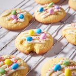 Roll tablespoon-sized portions of dough into balls and arrange them about 2 inches apart on the prepared baking sheet. Gently press several pastel candy-coated chocolates into the center of each dough ball. This creates that signature pastel candy “center” that makes this recipe so charming and fun.