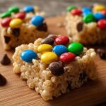 - Add toppings: Sprinkle mini chocolate chips and M&M’s evenly over the formed treats. Press them lightly into the surface so they stick as the treats firm up.