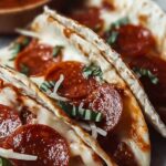 - Serve: Carefully remove the tacos from the oven and garnish with fresh basil leaves if desired. Serve immediately to enjoy the warm, melty, flavorful Pepperoni Pizza Tacos at their best.