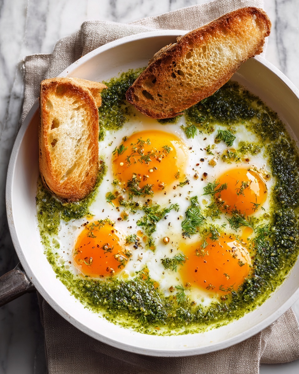 Crack the eggs directly into the skillet over the warmed pesto, letting the whites set slowly in that delicious herb-infused oil. Cook the eggs for 2 to 4 minutes depending on whether you like your yolks runny or fully set. The pesto will gently flavor the eggs from underneath, creating a flavor fusion that’s simply irresistible.