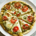 This vibrant Pesto Pizza recipe combines a homemade basil pesto with melted mozzarella and fresh tomatoes atop a crispy, golden pizza crust. Perfect for a flavorful and colorful meal, this pizza balances herbaceous pesto, creamy cheese, and juicy tomatoes, making a delightful Italian-inspired dish.