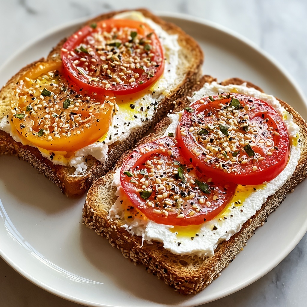 A simple and elegant Ricotta & Tomato Toast recipe featuring crusty sourdough bread topped with creamy fresh ricotta, juicy heirloom tomatoes, toasted sesame seeds, and a drizzle of extra virgin olive oil. Perfect for a quick breakfast or light snack that balances fresh flavors and textures.